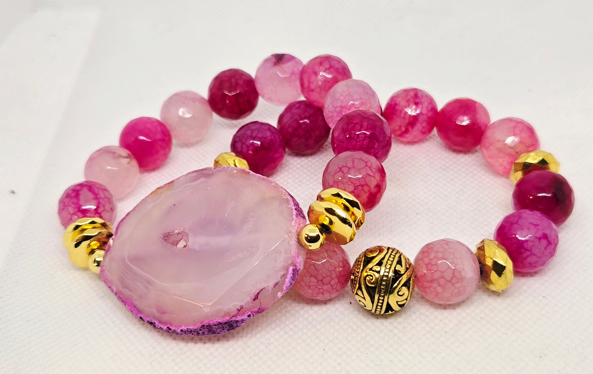 Pink chunky agate beads with pink agate slice and gold hematite accents