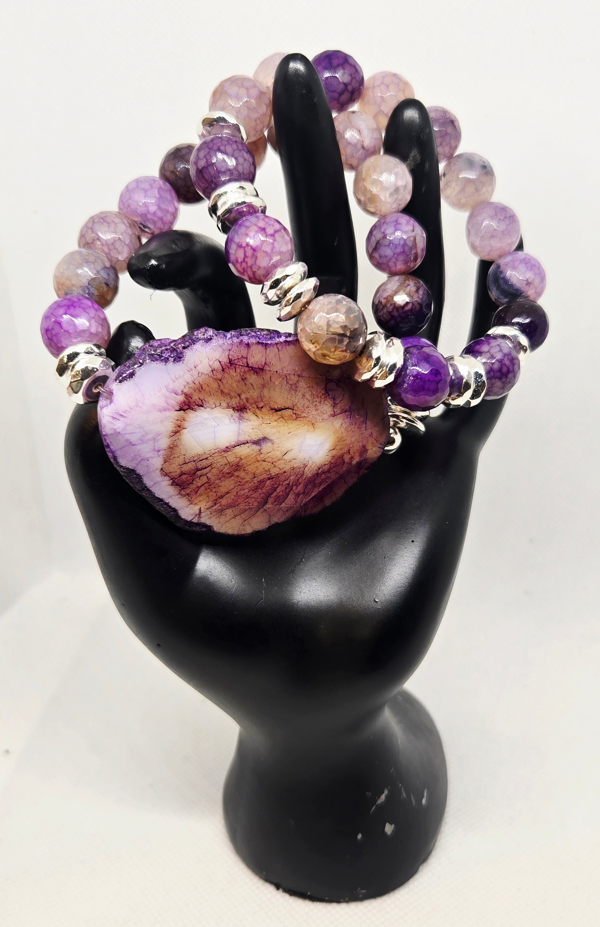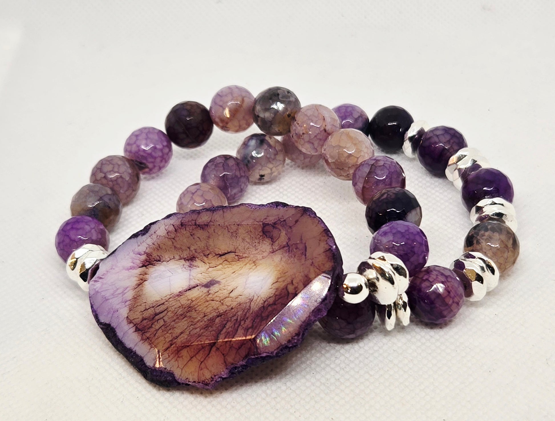 Purple agate chunky beads with large purple agate slice and silver hematite accents