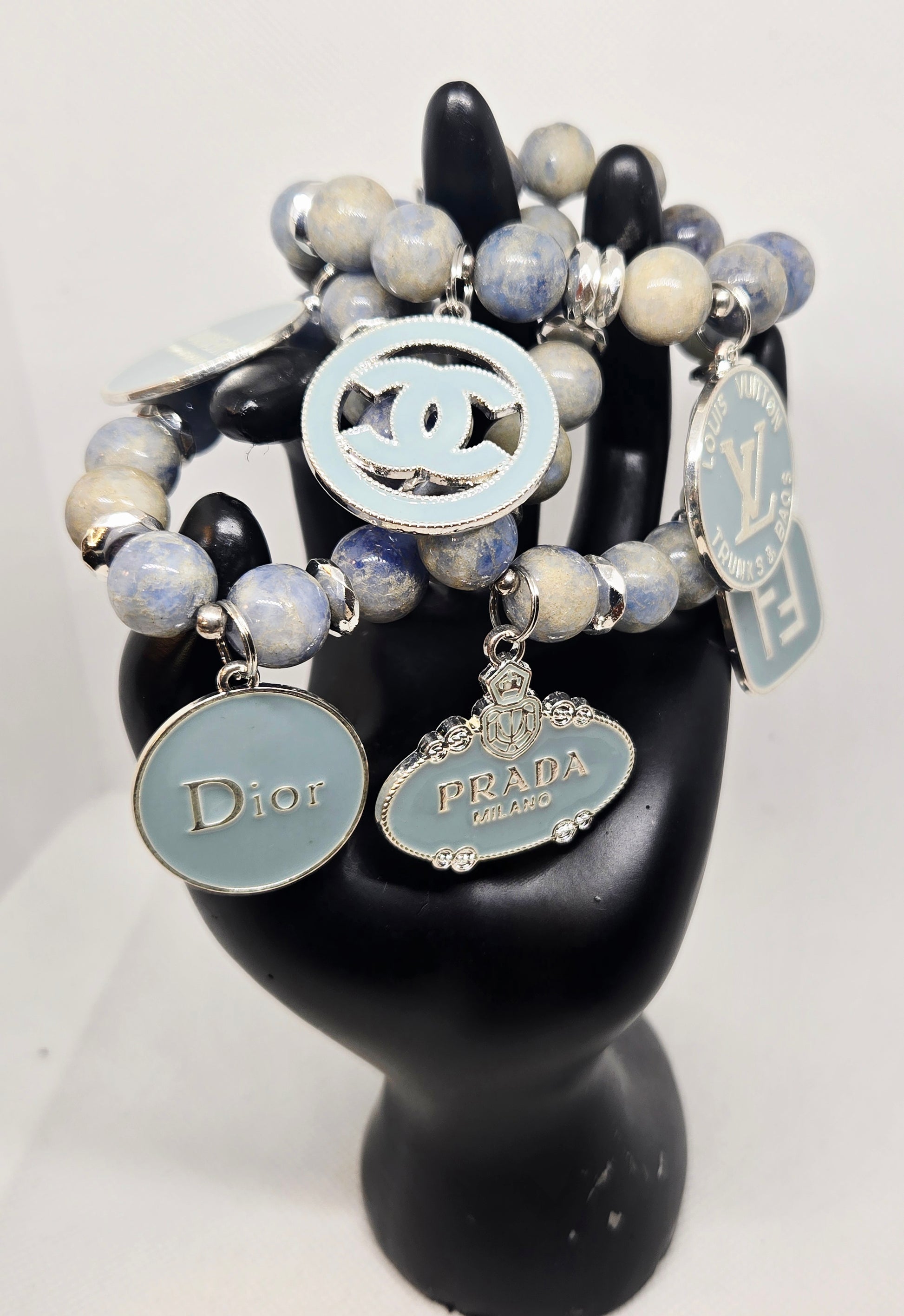 Denim and grey tone beads with silver hematite accents