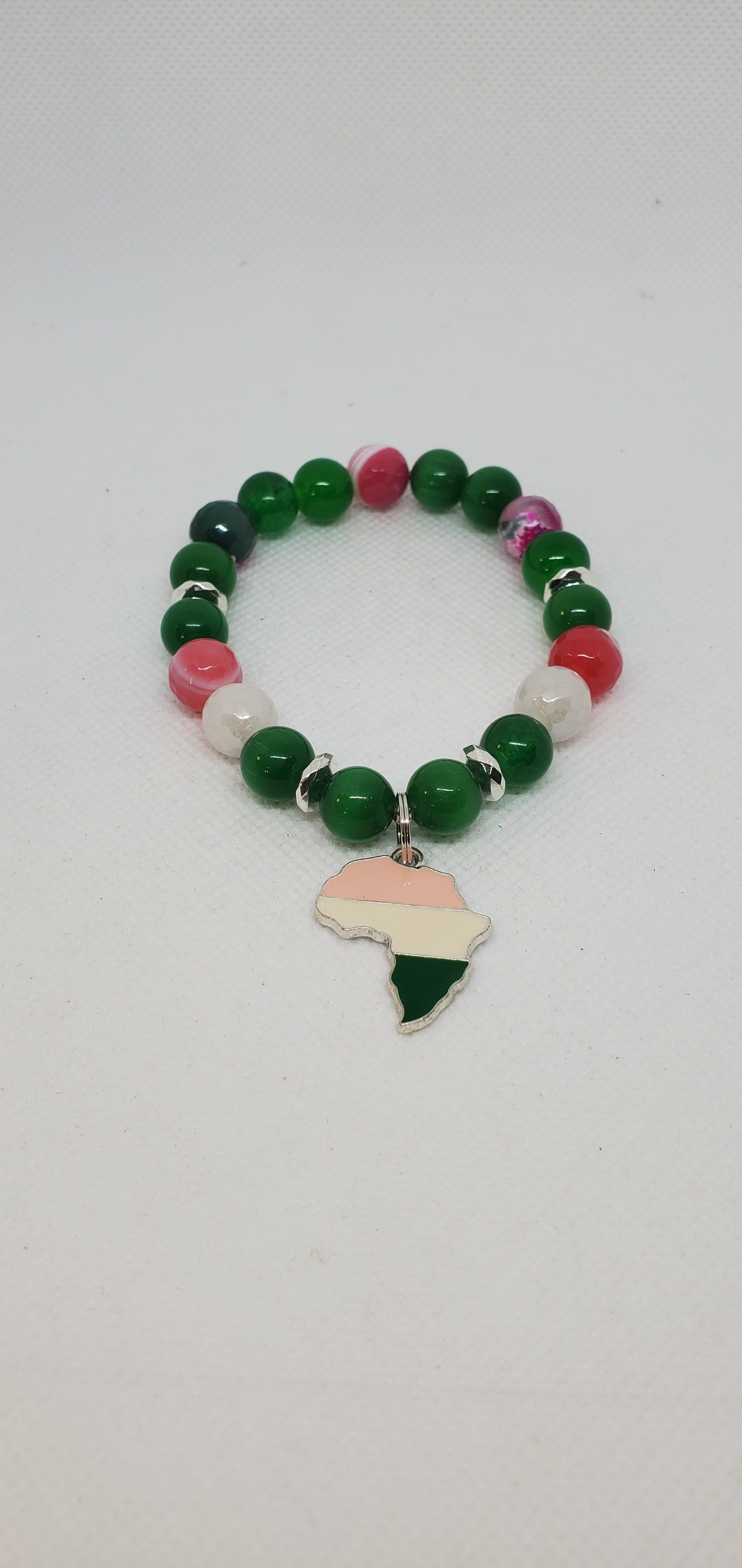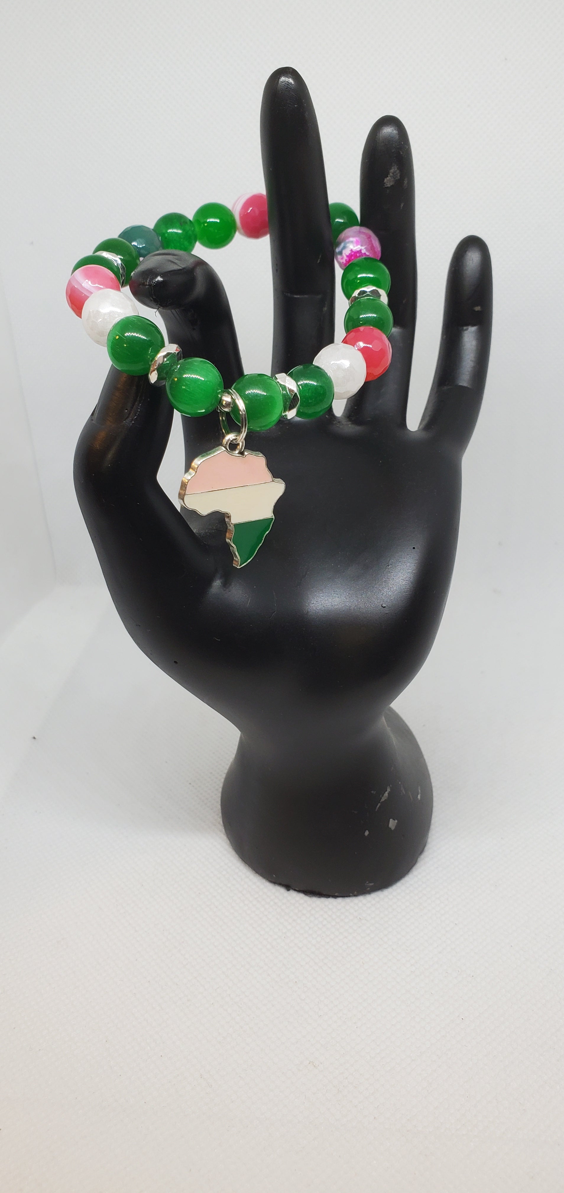 Green cate eye, pink agate and pink and green fire agate with pink and green Africa charm