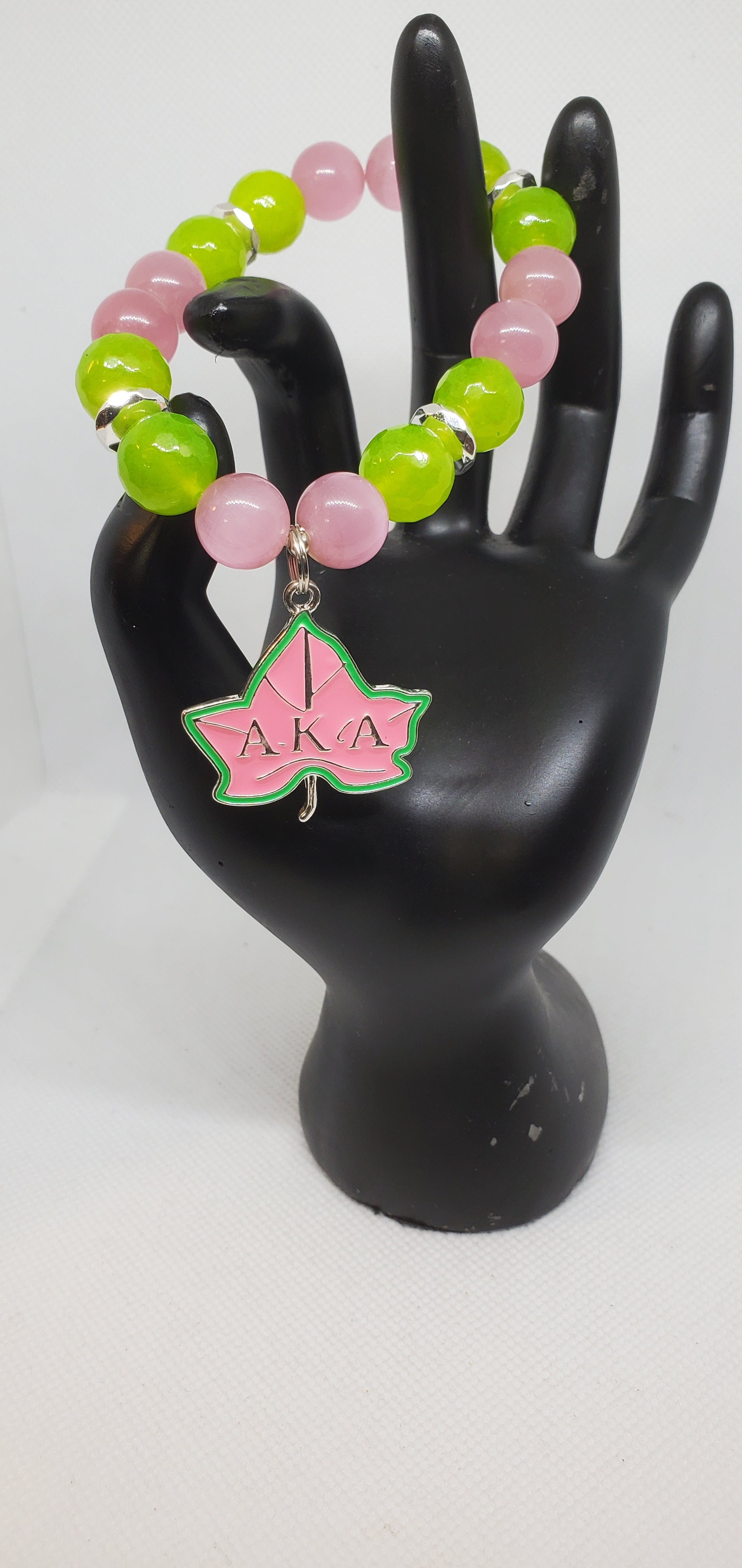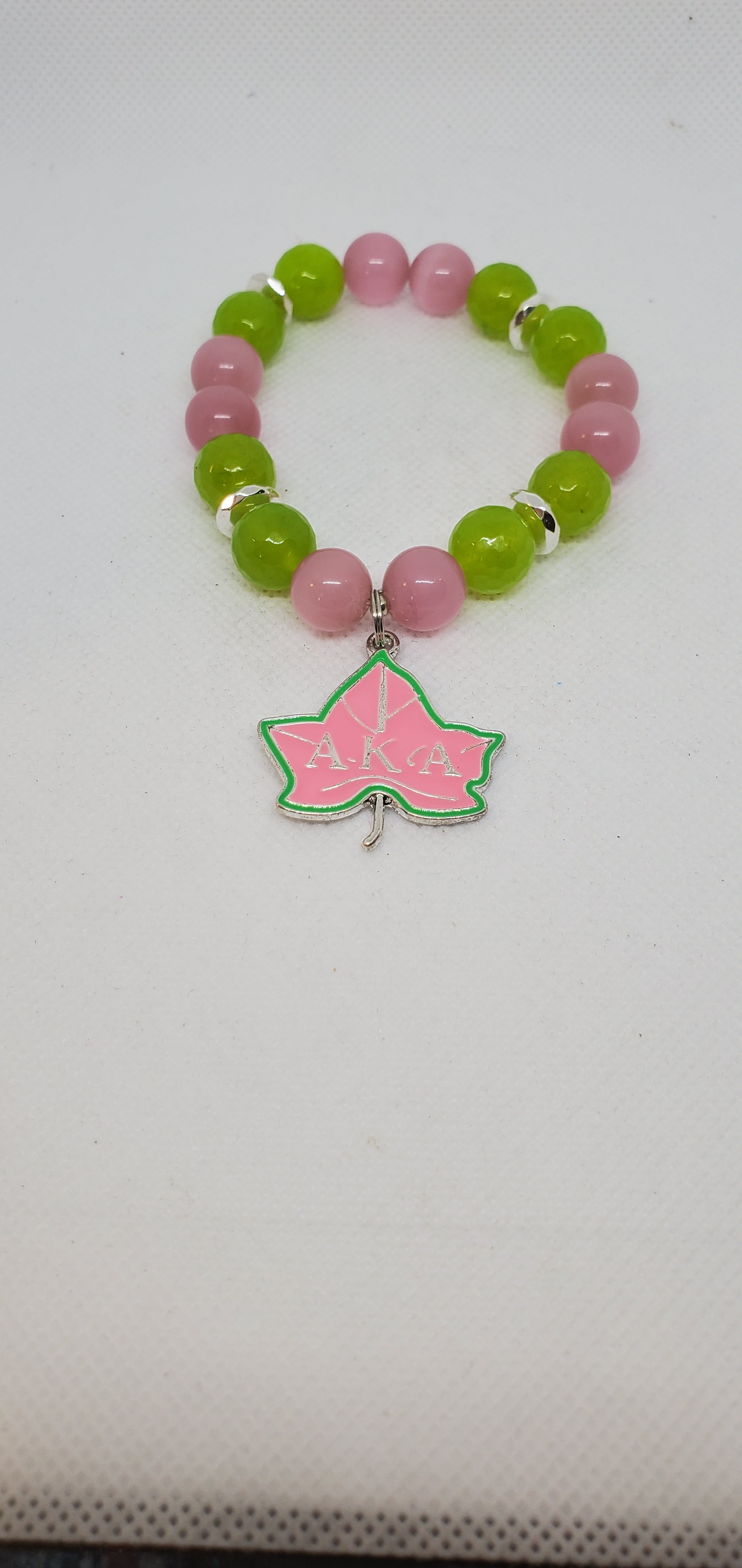 Chunky pink cat eye and green faceted jade with silver hamatite accents and a pink ivy charm