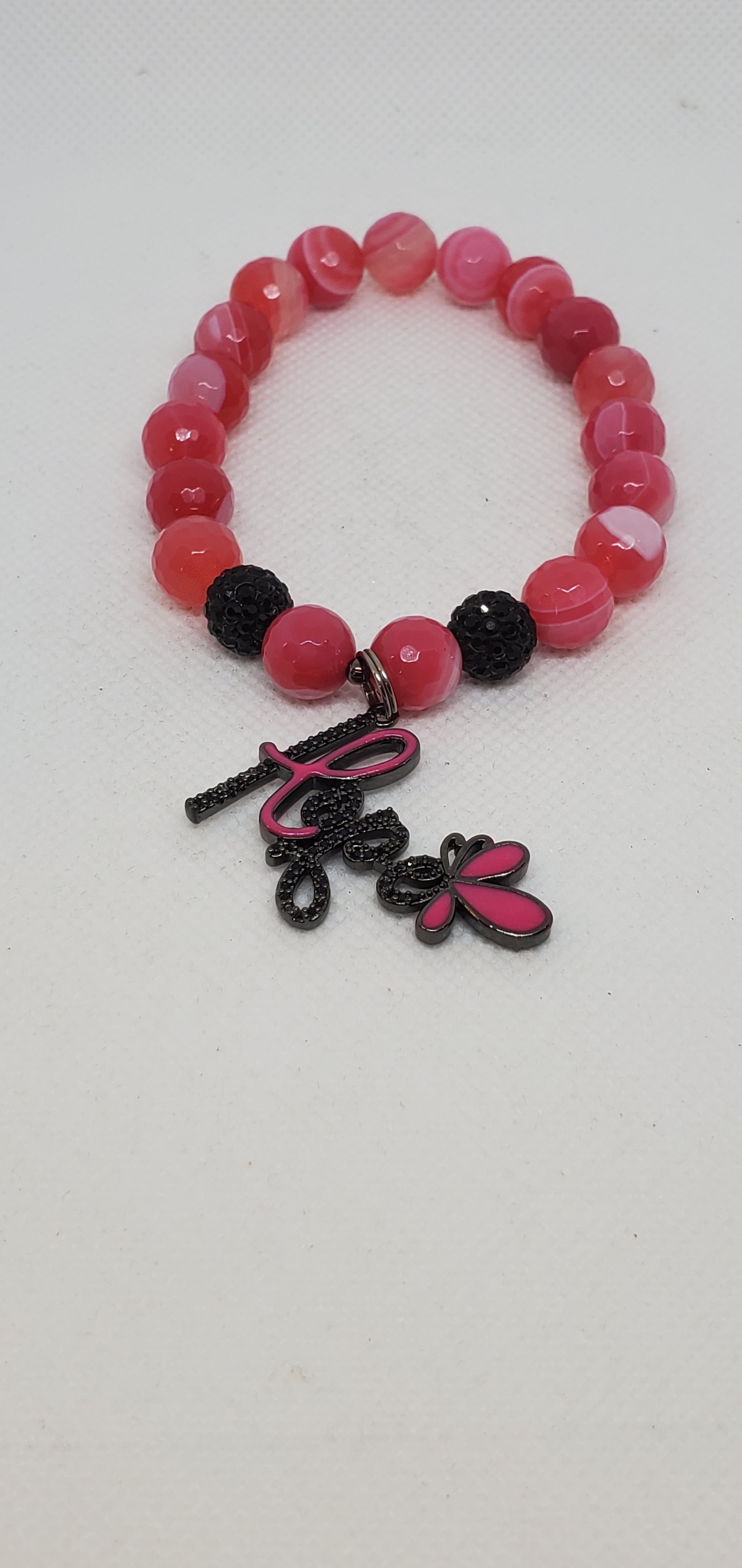 Pink agate and black pave with black hope breast cancer awareness charm