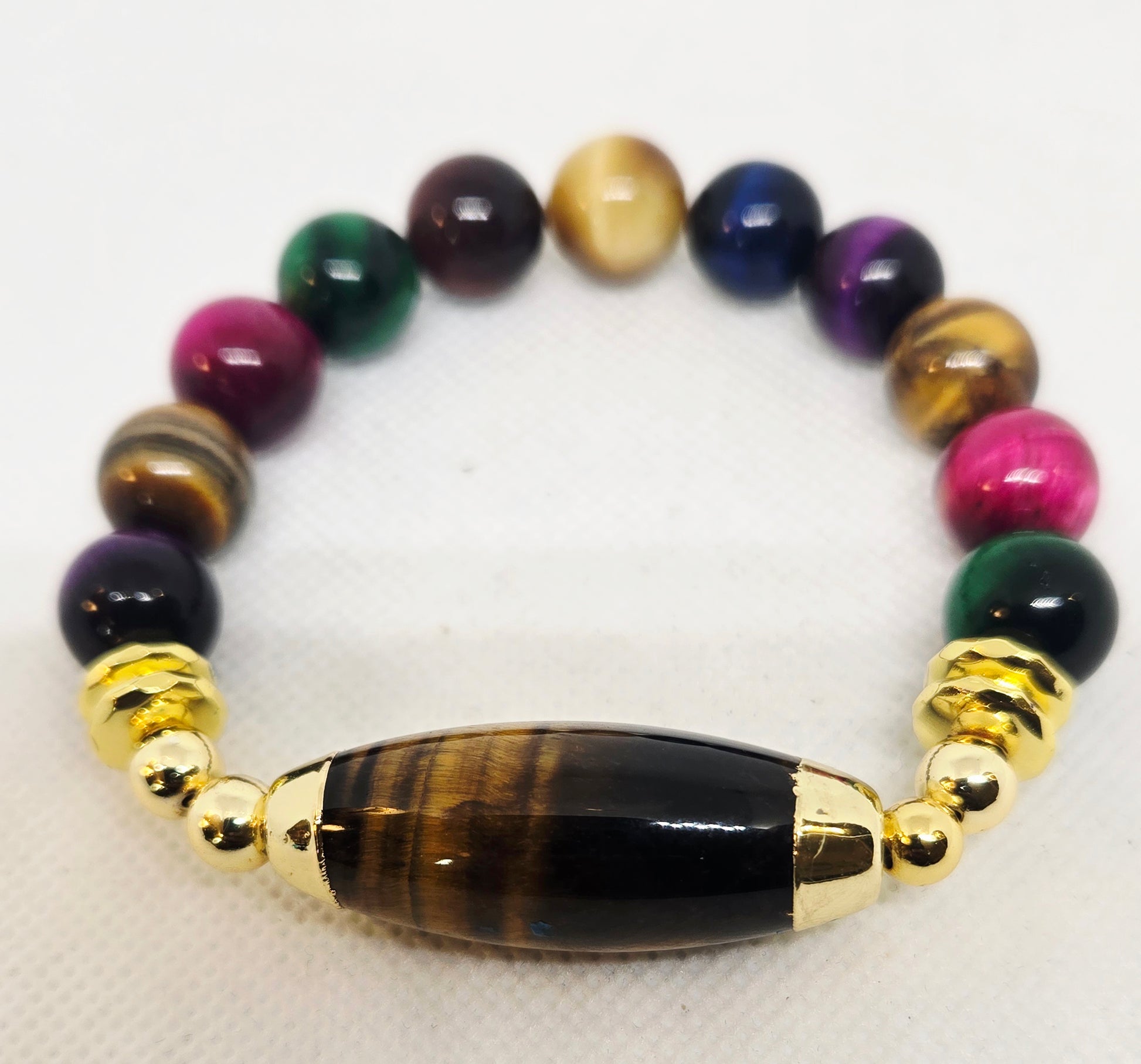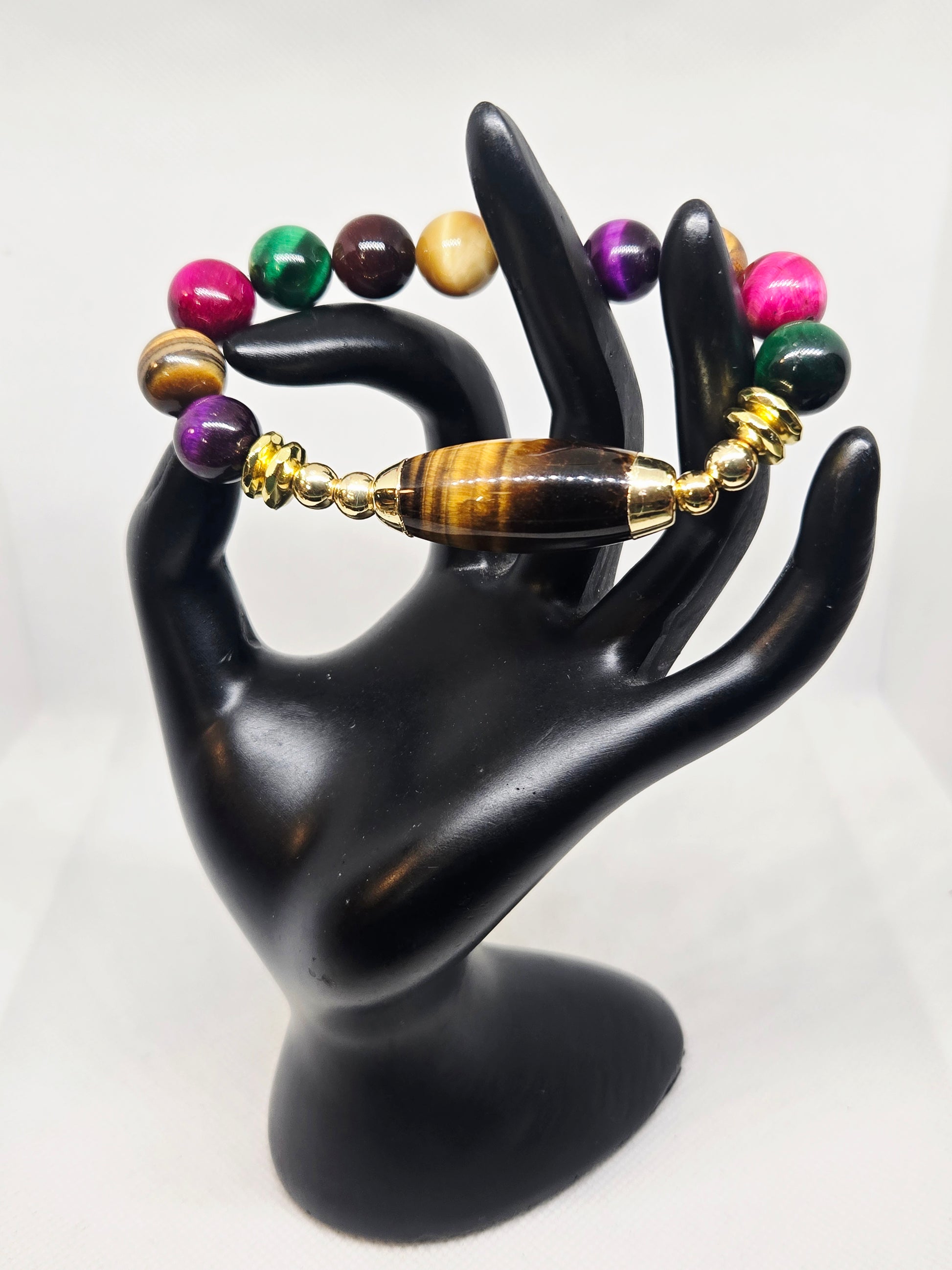Chunky multi colored tiger's eye with a brown tiger's eye focal barrel and gold hematite accents.