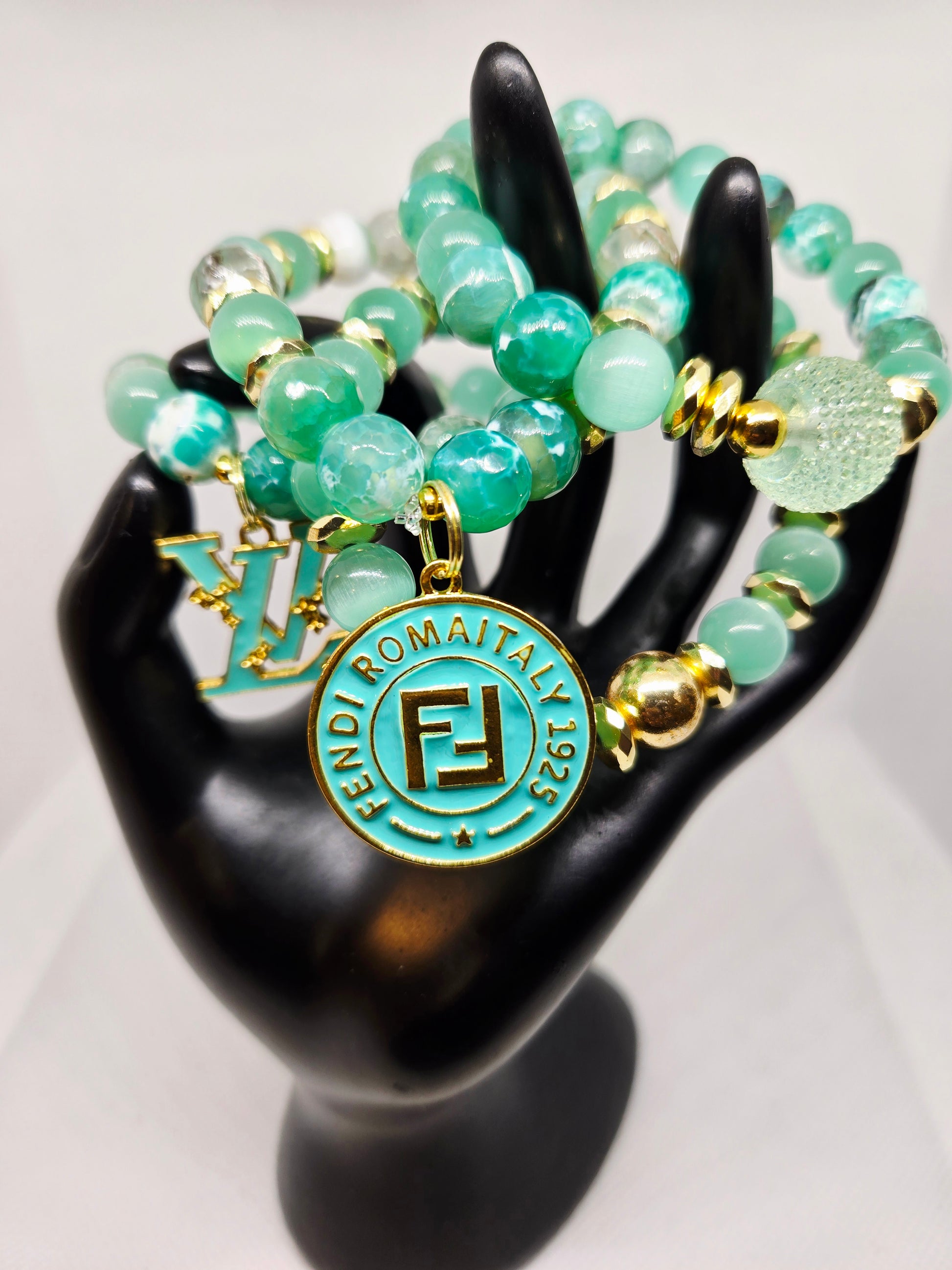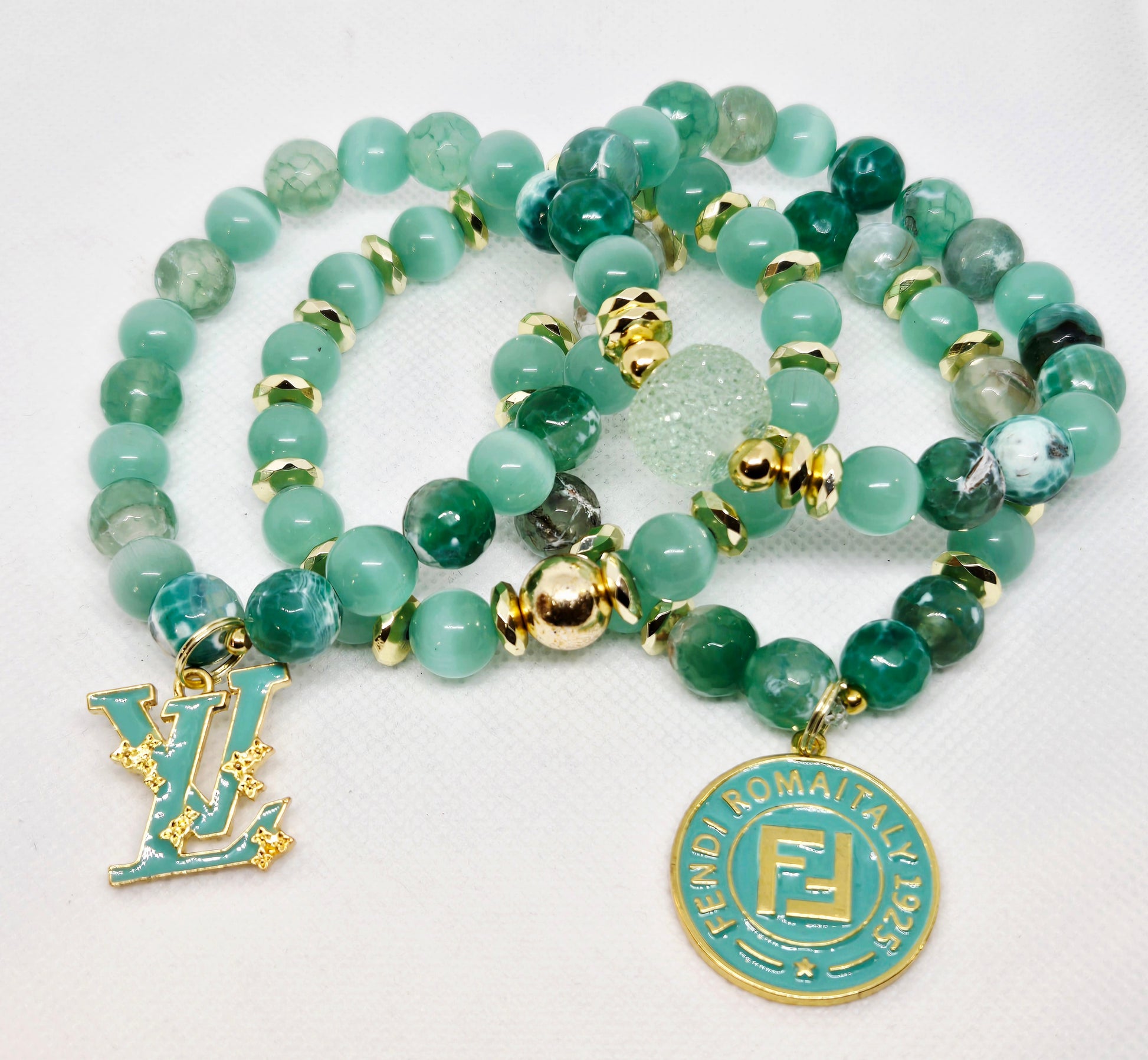Mix of mint green cat eye and fire agate with gold accents and fashion charms