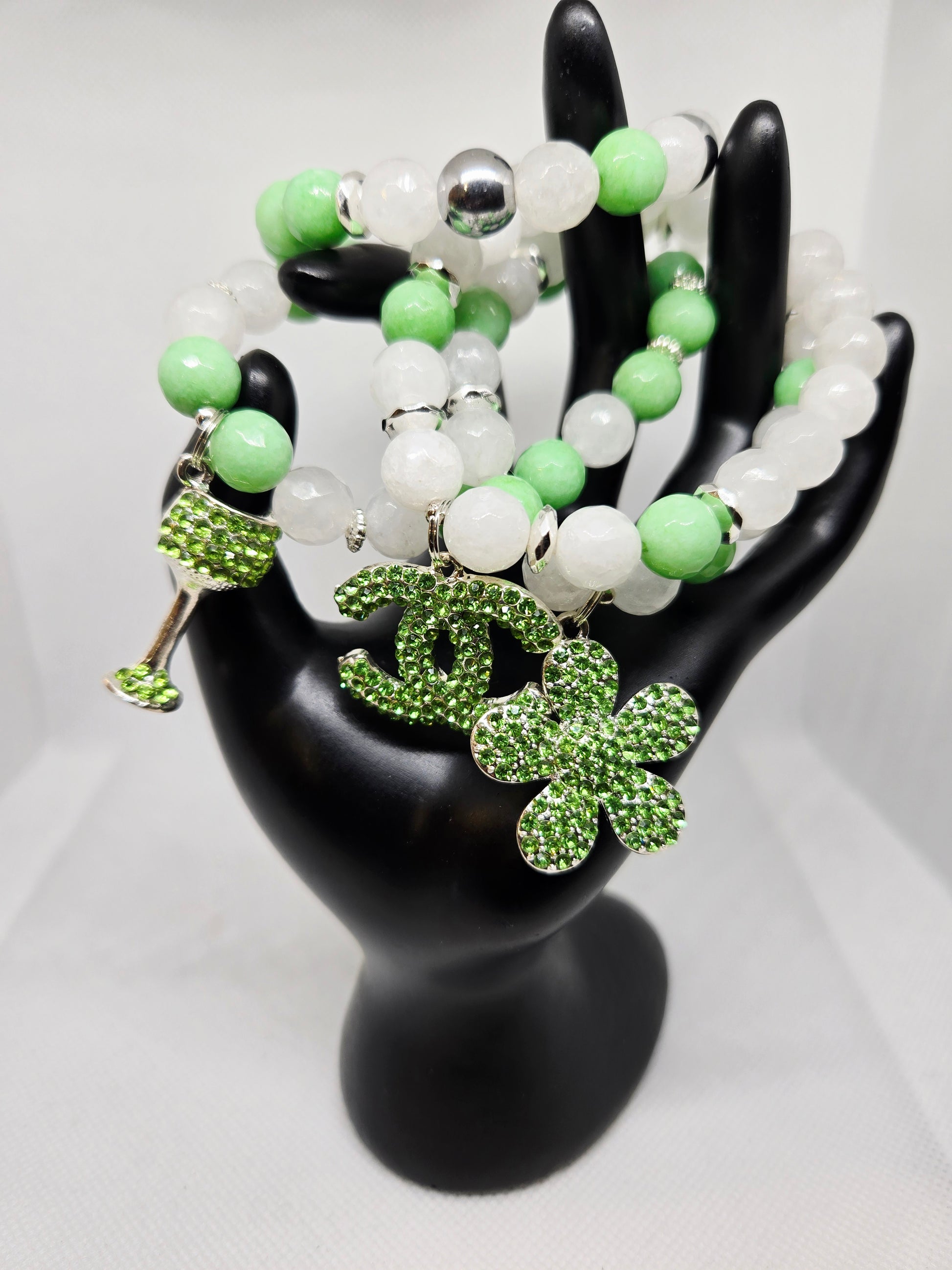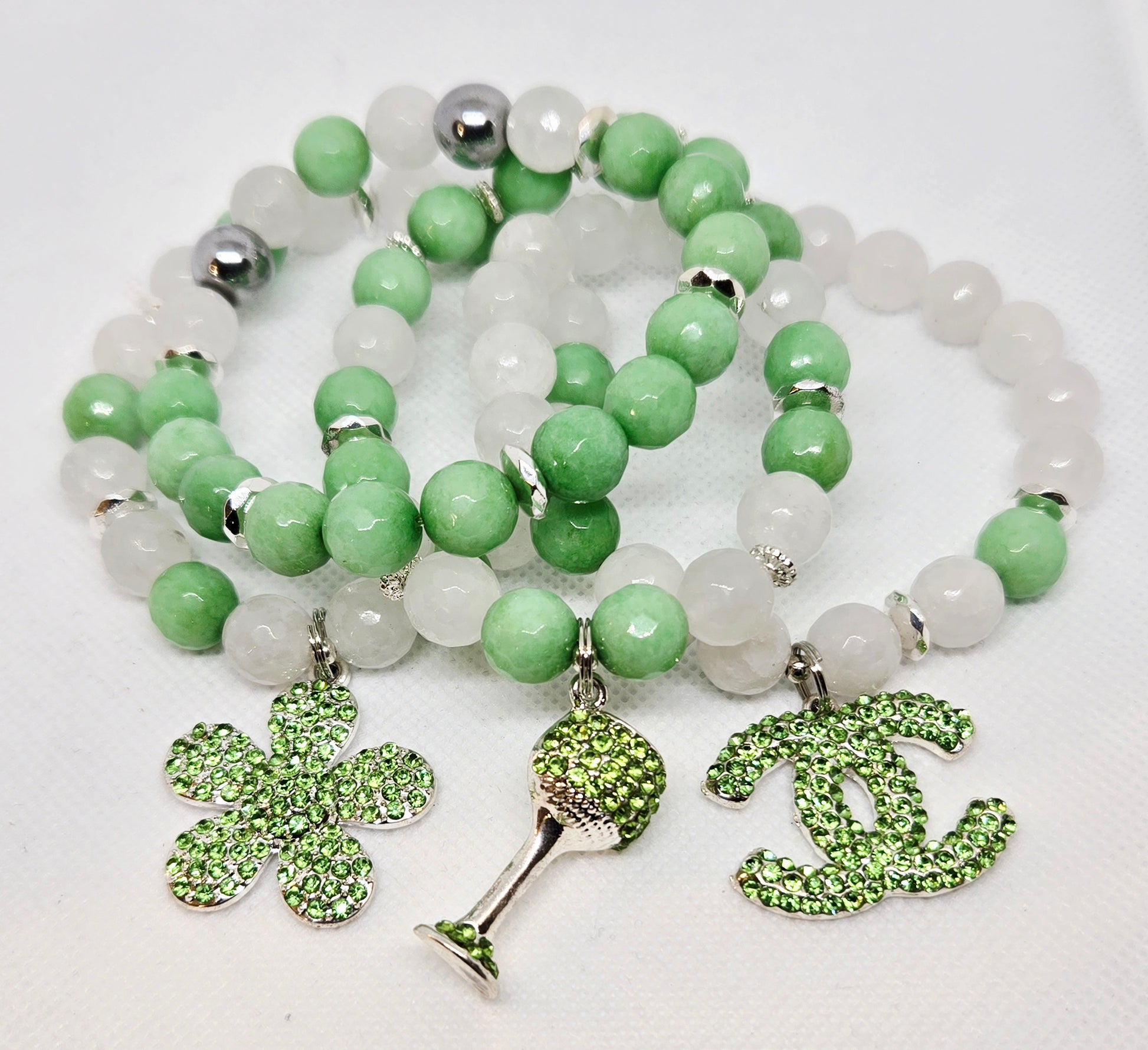 Mint green and white jade with green bling charms