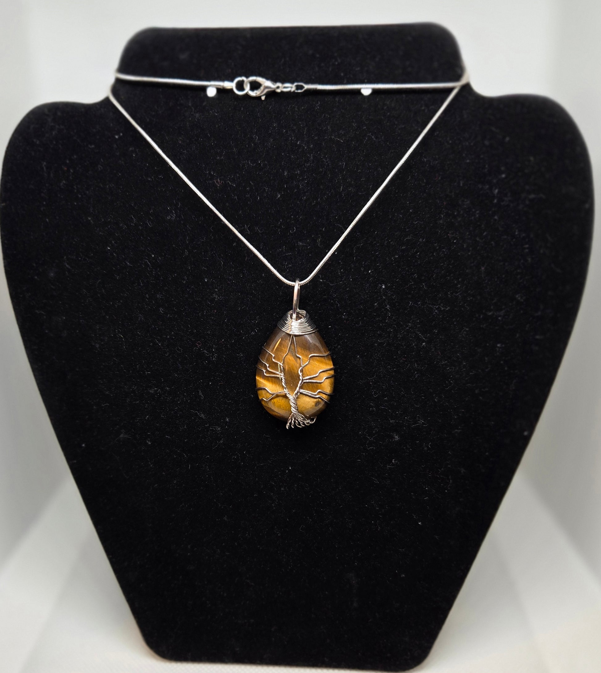 Wire wrapped tiger eye stone on a silver stainless steel chain