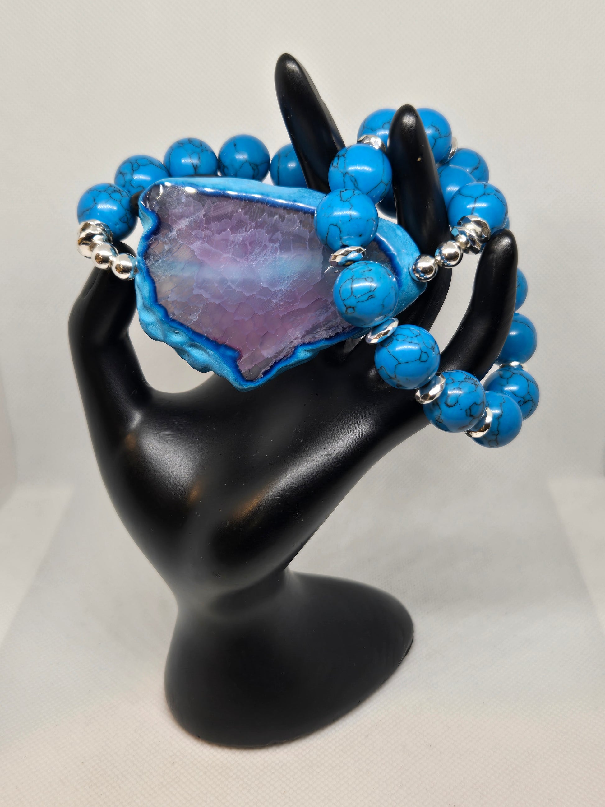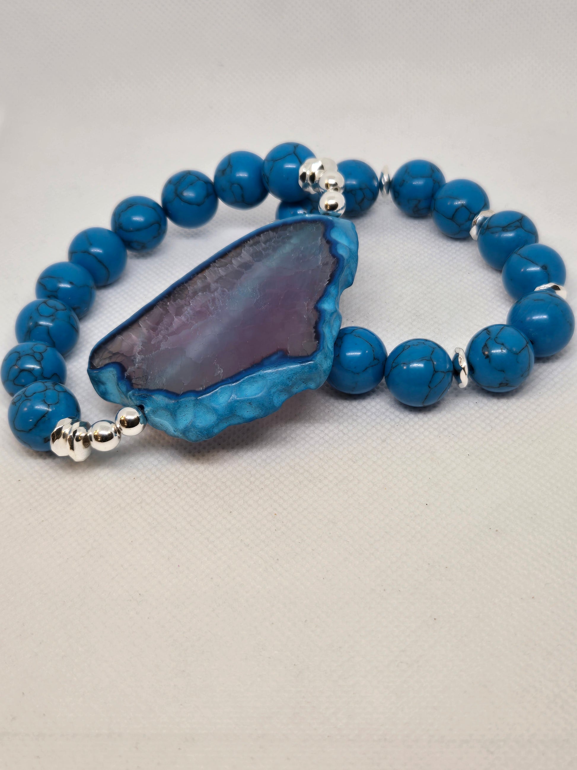 Blue turquoise beads with a turquoise and purple agate slice and silver hematite accents