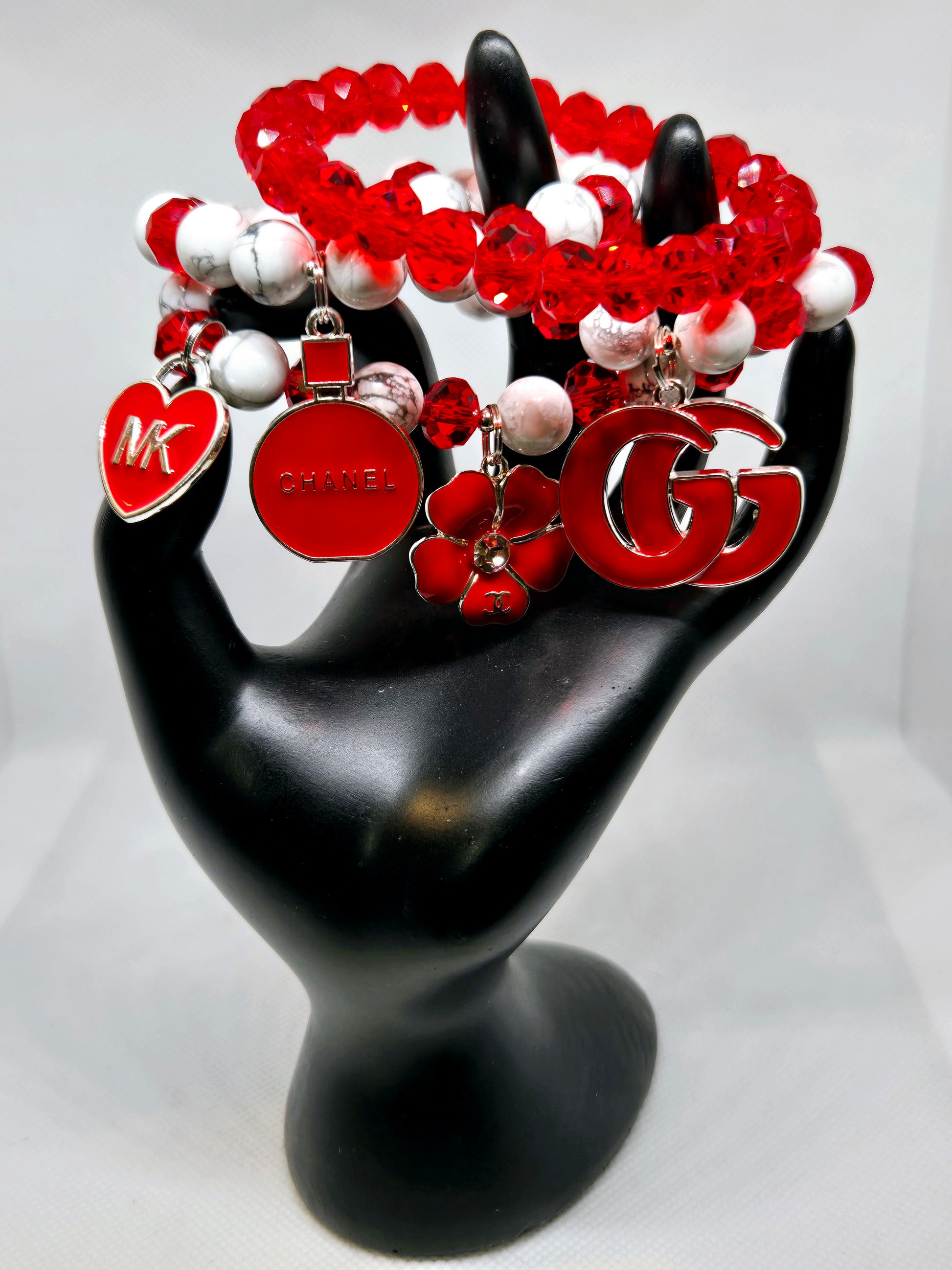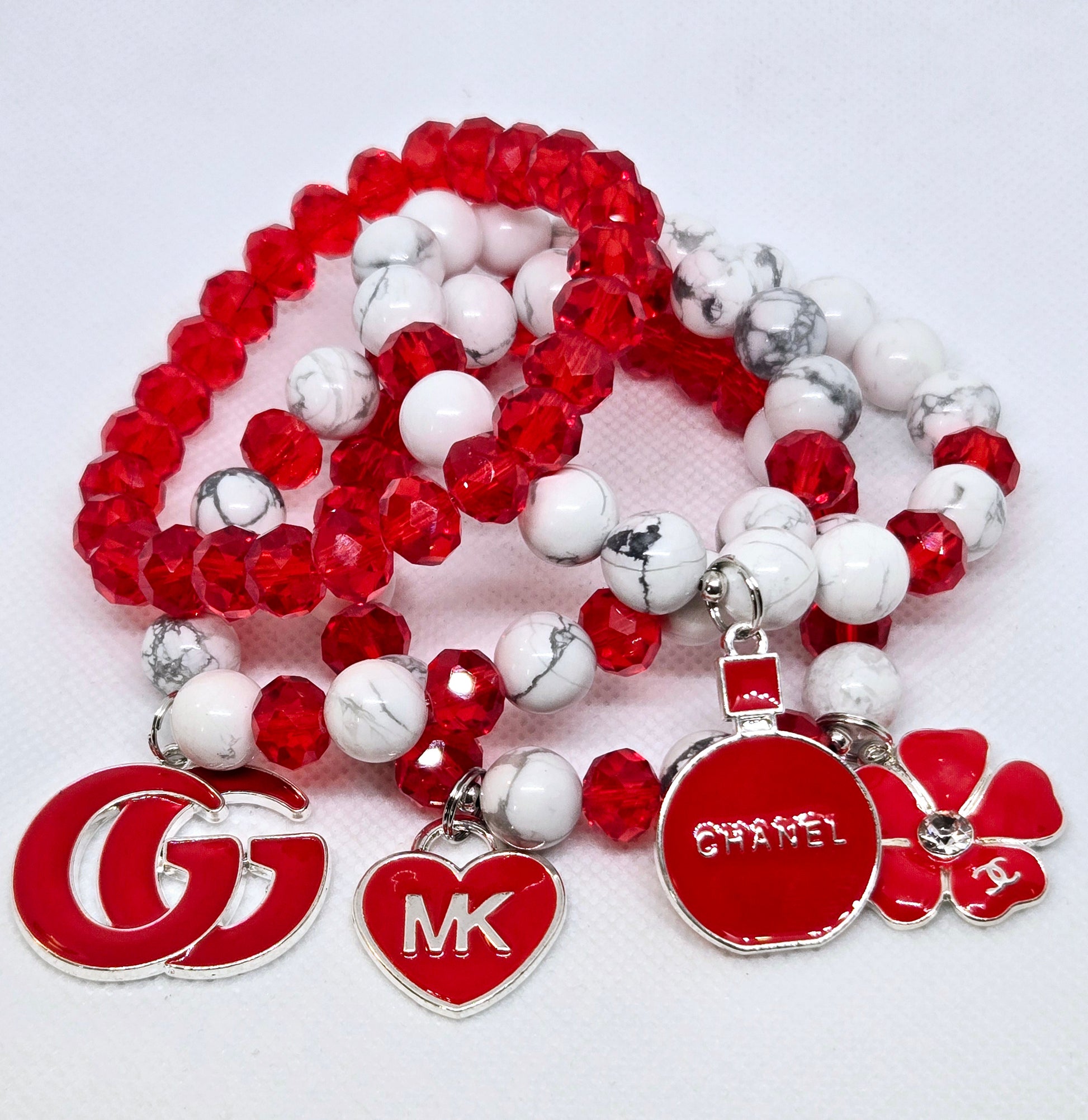 White Howlite and red crystal 4 stack fashion bracelets